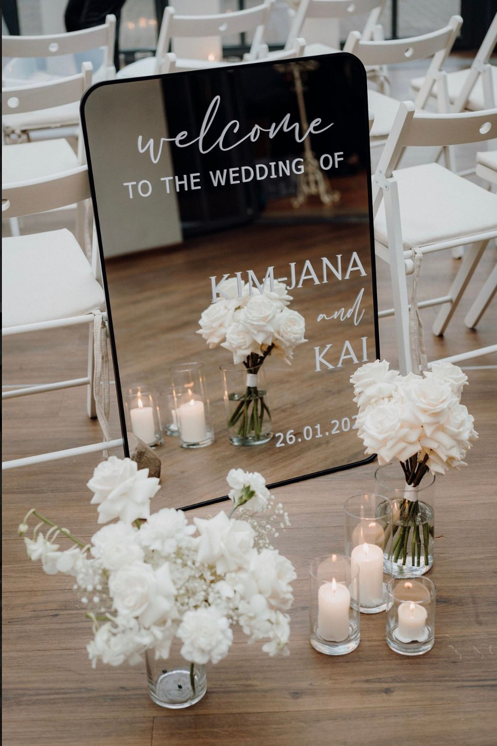 Setzen Sie stilvolle Akzente bei Ihrer Feier mit diesem eleganten, personalisierbaren Hochzeitsschild im modernen Spiegel-Design. Die glänzende Oberfläche verleiht dem Schild eine edle Optik und sorgt für einen besonderen Blickfang – perfekt für den Eingangsbereich Ihrer Hochzeit oder anderer Events.